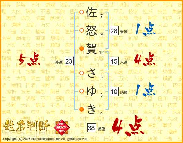 佐怒賀さゆきさんの総運は38画の4点!