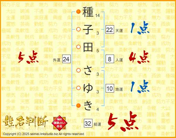 種子田さゆきさんの総運は32画の5点!