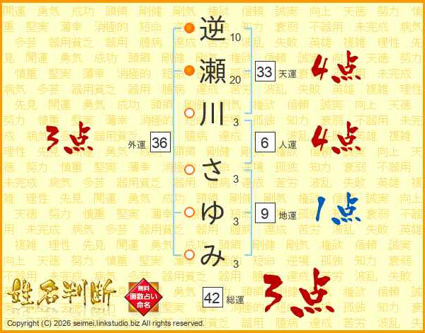 逆瀬川さゆみさんの総運は42画の3点!