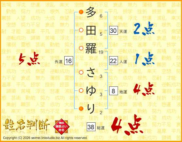 多(6画)田(5画)羅(19画) さ(3画)ゆ(3画)り(2画)