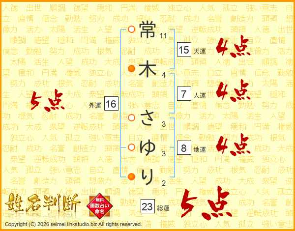 生活面を象徴する運勢です。外部から受ける影響力を表し、結婚運、家庭運や職場、環境への順応性を表します。総運から人運を引いた画数。姓や名が1文字の場合を除く。