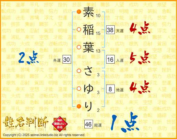 素(10画)稲(15画)葉(13画) さ(3画)ゆ(3画)り(2画)
