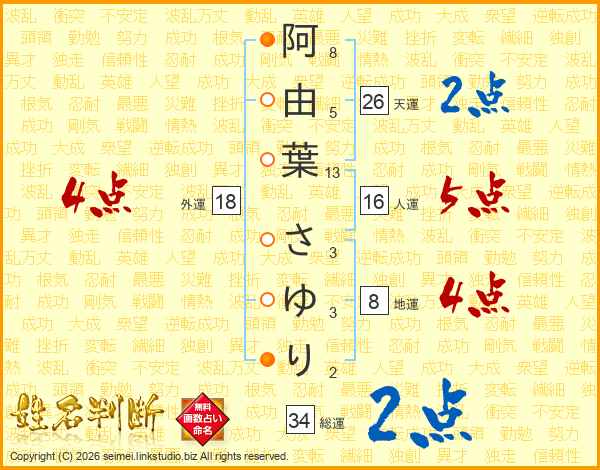 阿(8画)由(5画)葉(13画) さ(3画)ゆ(3画)り(2画)