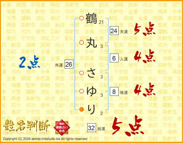 鶴丸さゆりさんの総運は32画の5点!