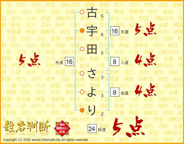 古(5画)宇(6画)田(5画) さ(3画)よ(3画)り(2画)
