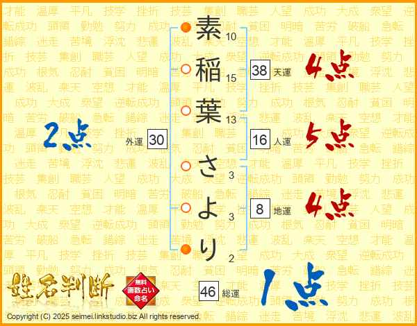 素(10画)稲(15画)葉(13画) さ(3画)よ(3画)り(2画)