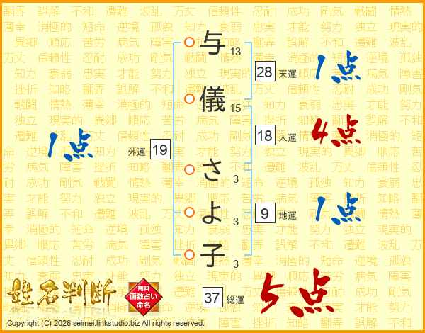与(13画)儀(15画) さ(3画)よ(3画)子(3画)