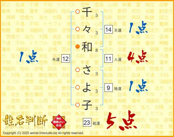千(3画)々(3画)和(8画) さ(3画)よ(3画)子(3画)
