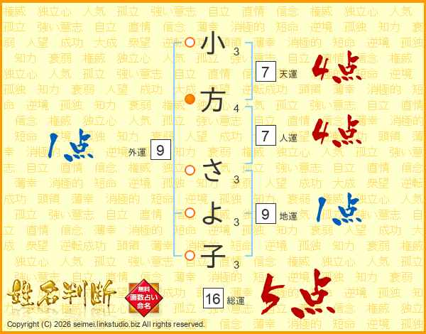 生活面を象徴する運勢です。外部から受ける影響力を表し、結婚運、家庭運や職場、環境への順応性を表します。総運から人運を引いた画数。姓や名が1文字の場合を除く。