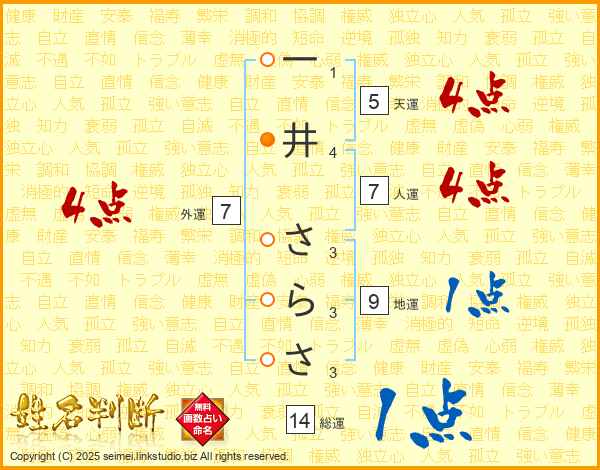 生活面を象徴する運勢です。外部から受ける影響力を表し、結婚運、家庭運や職場、環境への順応性を表します。総運から人運を引いた画数。姓や名が1文字の場合を除く。