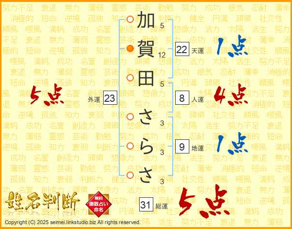 加(5画)賀(12画)田(5画) さ(3画)ら(3画)さ(3画)
