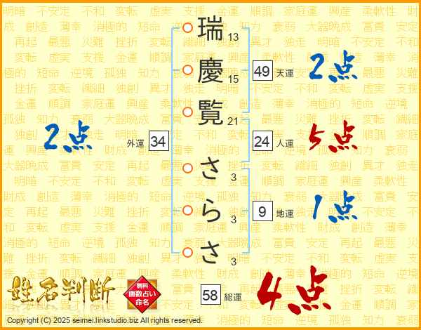 瑞(13画)慶(15画)覧(21画) さ(3画)ら(3画)さ(3画)