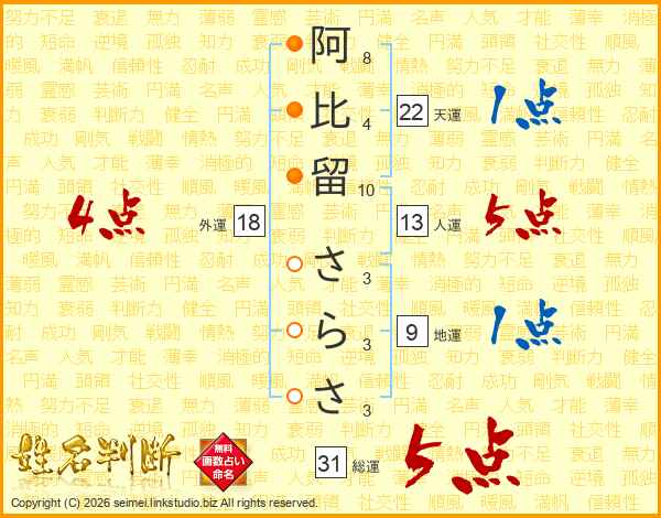 阿(8画)比(4画)留(10画) さ(3画)ら(3画)さ(3画)
