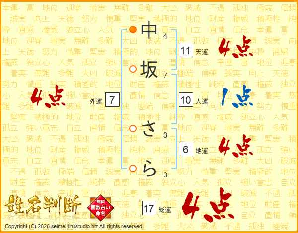 生活面を象徴する運勢です。外部から受ける影響力を表し、結婚運、家庭運や職場、環境への順応性を表します。総運から人運を引いた画数。姓や名が1文字の場合を除く。