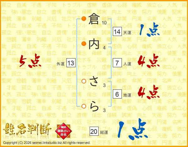 生活面を象徴する運勢です。外部から受ける影響力を表し、結婚運、家庭運や職場、環境への順応性を表します。総運から人運を引いた画数。姓や名が1文字の場合を除く。
