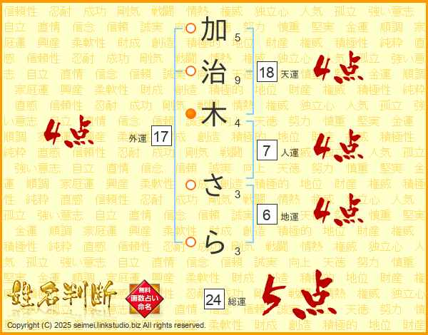 加(5画)治(9画)木(4画) さ(3画)ら(3画)