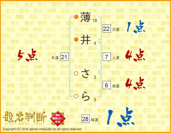 薄井さらさんの外運は21画の5点!