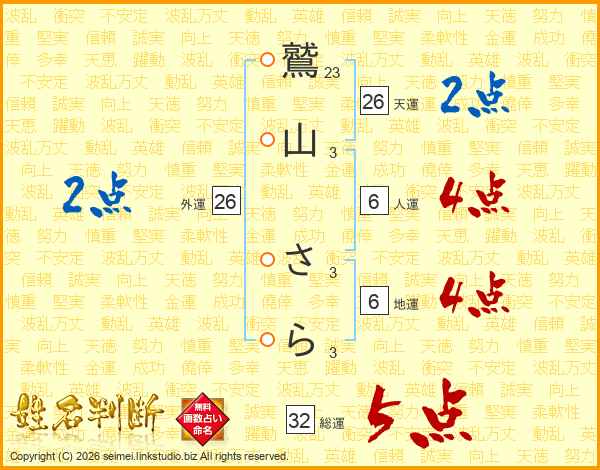 鷲(23画)山(3画) さ(3画)ら(3画)