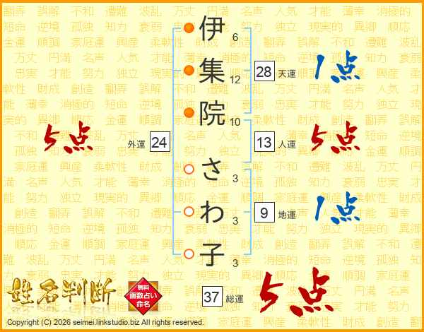 伊集院さわ子さんの総運は37画の5点!