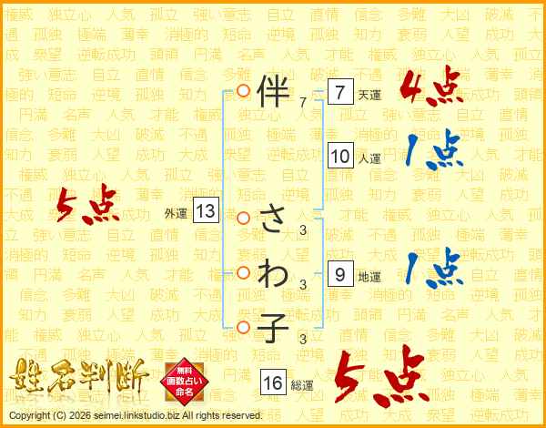 伴さわ子さんの総運は16画の5点!