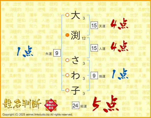 大(3画)渕(12画) さ(3画)わ(3画)子(3画)