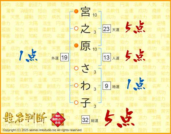 宮(10画)之(3画)原(10画) さ(3画)わ(3画)子(3画)