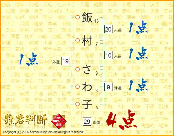 飯村さわ子さんの総運は29画の4点!