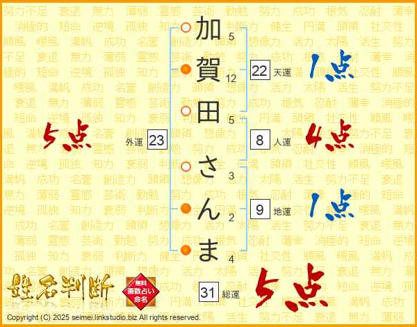 加(5画)賀(12画)田(5画) さ(3画)ん(2画)ま(4画)