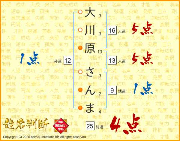 生活面を象徴する運勢です。外部から受ける影響力を表し、結婚運、家庭運や職場、環境への順応性を表します。総運から人運を引いた画数。姓や名が1文字の場合を除く。