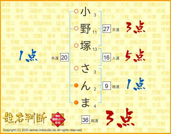 小(3画)野(11画)塚(13画) さ(3画)ん(2画)ま(4画)