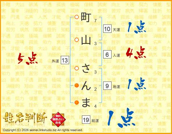 生活面を象徴する運勢です。外部から受ける影響力を表し、結婚運、家庭運や職場、環境への順応性を表します。総運から人運を引いた画数。姓や名が1文字の場合を除く。