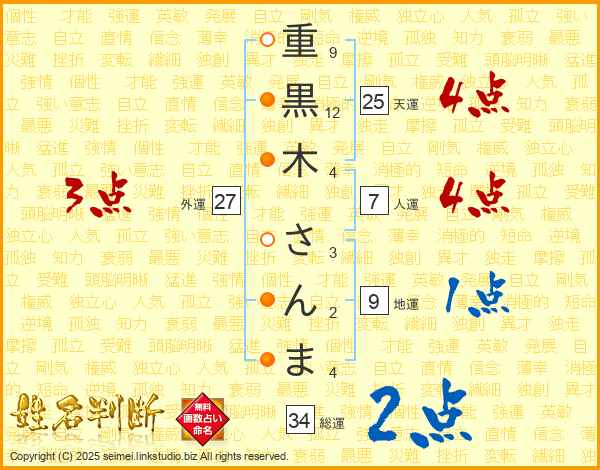 重(9画)黒(12画)木(4画) さ(3画)ん(2画)ま(4画)
