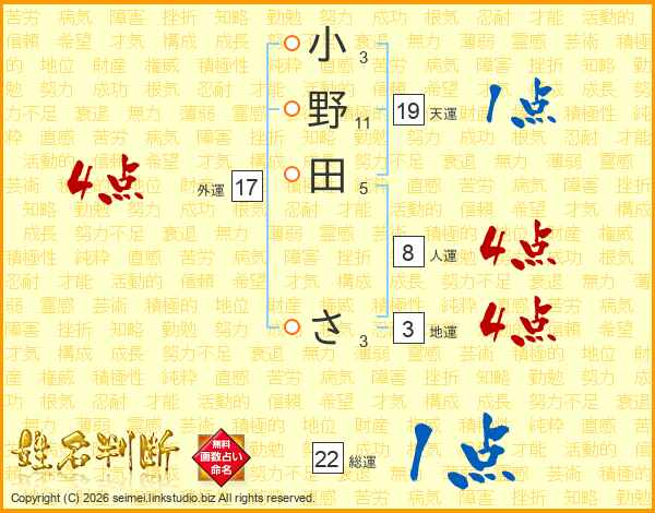 生活面を象徴する運勢です。外部から受ける影響力を表し、結婚運、家庭運や職場、環境への順応性を表します。総運から人運を引いた画数。姓や名が1文字の場合を除く。