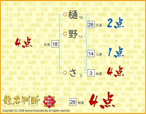 生活面を象徴する運勢です。外部から受ける影響力を表し、結婚運、家庭運や職場、環境への順応性を表します。総運から人運を引いた画数。姓や名が1文字の場合を除く。
