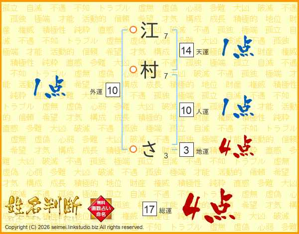 生活面を象徴する運勢です。外部から受ける影響力を表し、結婚運、家庭運や職場、環境への順応性を表します。総運から人運を引いた画数。姓や名が1文字の場合を除く。