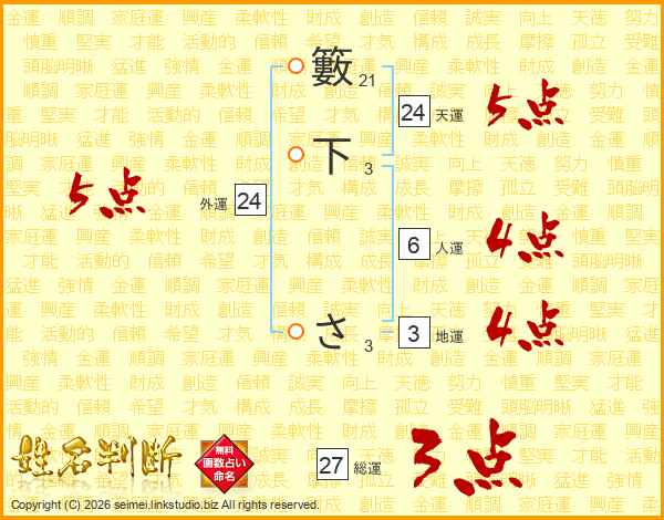 生活面を象徴する運勢です。外部から受ける影響力を表し、結婚運、家庭運や職場、環境への順応性を表します。総運から人運を引いた画数。姓や名が1文字の場合を除く。