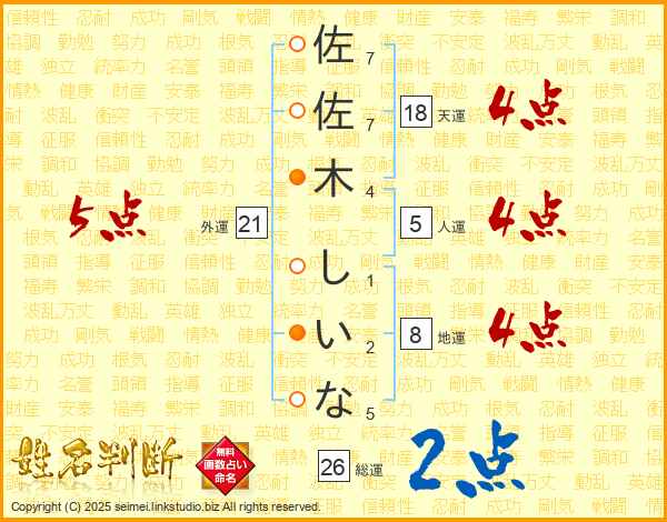 佐(7画)佐(7画)木(4画) し(1画)い(2画)な(5画)
