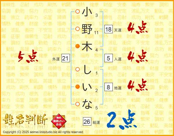小野木しいなさんの総運は26画の2点!