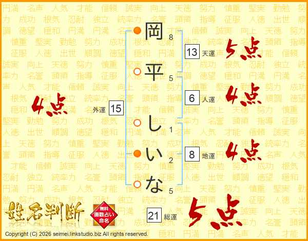 岡(8画)平(5画) し(1画)い(2画)な(5画)