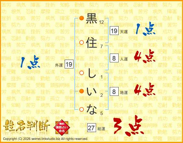 黒(12画)住(7画) し(1画)い(2画)な(5画)
