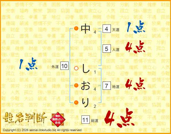 生活面を象徴する運勢です。外部から受ける影響力を表し、結婚運、家庭運や職場、環境への順応性を表します。総運から人運を引いた画数。姓や名が1文字の場合を除く。