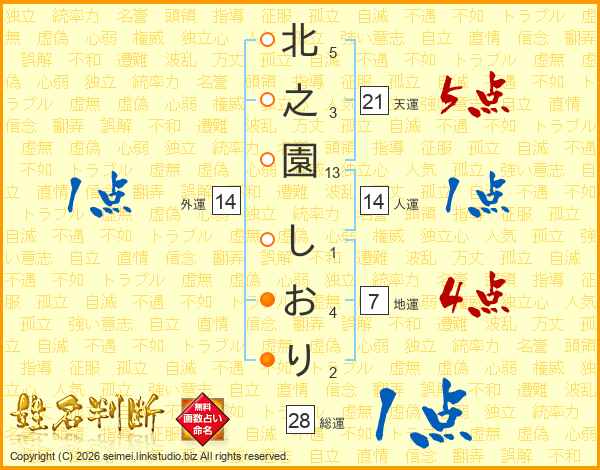 生活面を象徴する運勢です。外部から受ける影響力を表し、結婚運、家庭運や職場、環境への順応性を表します。総運から人運を引いた画数。姓や名が1文字の場合を除く。