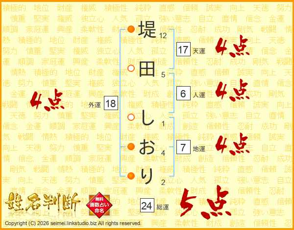生活面を象徴する運勢です。外部から受ける影響力を表し、結婚運、家庭運や職場、環境への順応性を表します。総運から人運を引いた画数。姓や名が1文字の場合を除く。
