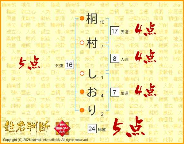 桐(10画)村(7画) し(1画)お(4画)り(2画)
