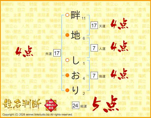 生活面を象徴する運勢です。外部から受ける影響力を表し、結婚運、家庭運や職場、環境への順応性を表します。総運から人運を引いた画数。姓や名が1文字の場合を除く。