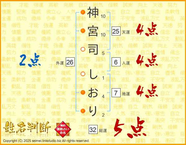 神宮司しおりさんの総運は32画の5点!