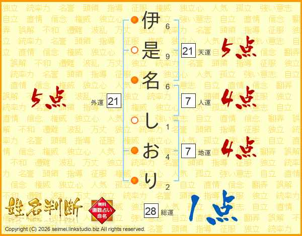 伊(6画)是(9画)名(6画) し(1画)お(4画)り(2画)