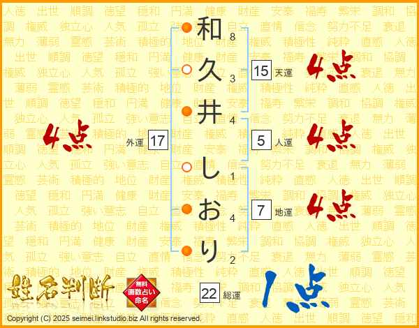 生活面を象徴する運勢です。外部から受ける影響力を表し、結婚運、家庭運や職場、環境への順応性を表します。総運から人運を引いた画数。姓や名が1文字の場合を除く。