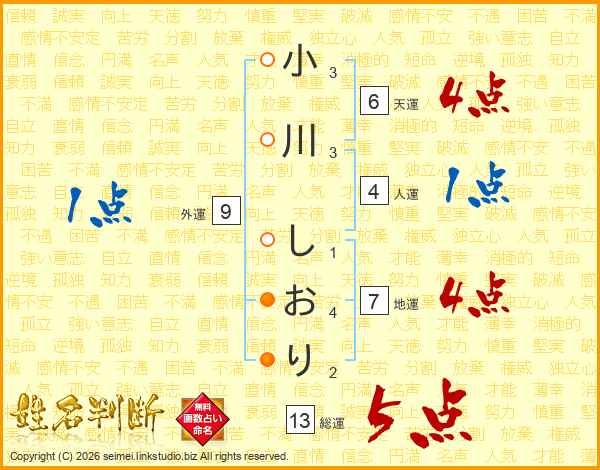 生活面を象徴する運勢です。外部から受ける影響力を表し、結婚運、家庭運や職場、環境への順応性を表します。総運から人運を引いた画数。姓や名が1文字の場合を除く。