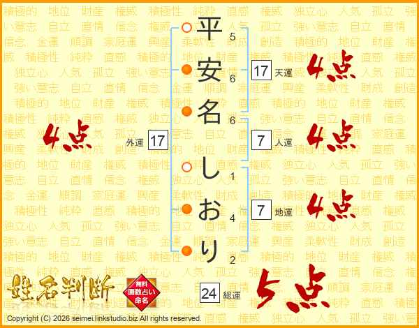 平(5画)安(6画)名(6画) し(1画)お(4画)り(2画)
